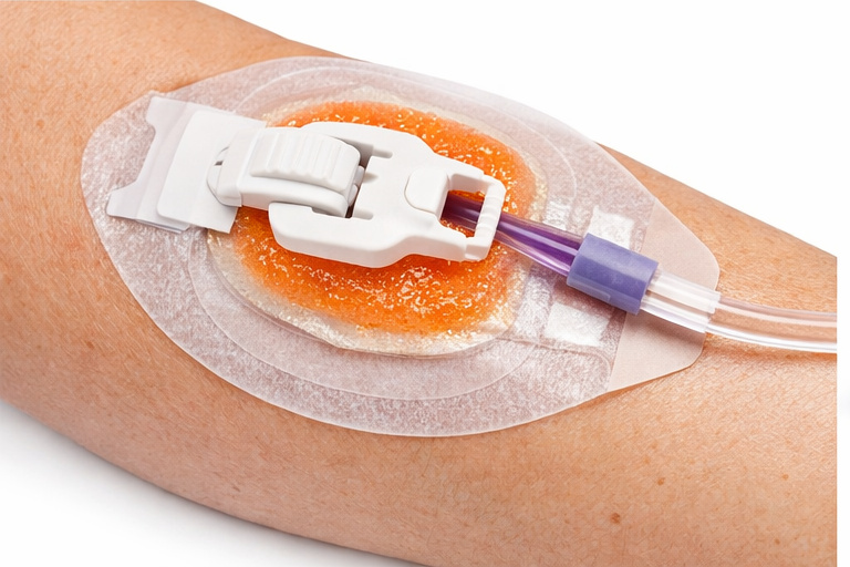 Součástí krytí je gelový polštářek s chlorhexidin glukonátem (CHG), který poskytuje kontinuální antimikrobiální ochranu v místě vstupu katétru a pomáhá snižovat riziko CRBSI (katétrových krevních infekcí).