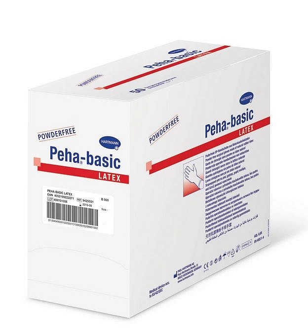 Peha-basic jsou bezpudrové rukavice vyrobené z přírodního latexu. Mají plně anatomický tvar, hladký povrch a zesílenou manžetu. Jsou vysoce pružné a rezistentní proti roztržení. Chlorovaná vnitřní vrstva zajišťuje snadné navlékání.