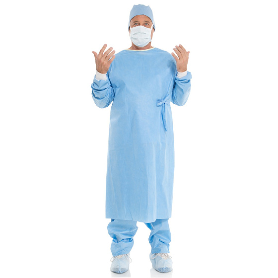 Sterilní chirurgický plášť z netkané textilie typu SMMMS, tmavě modrá. Balení obsahuje dva savé ručníky.